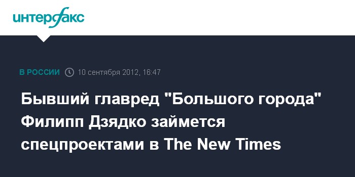 Москва. 10 сентября. INTERFAX.RU - Бывший главный редактор журнала "Большой город" Филипп Дзядко займет должность редактора по спецпроектам журнала The New Times, сообщила в понедельник редактор этого издания Евгения Альбац.