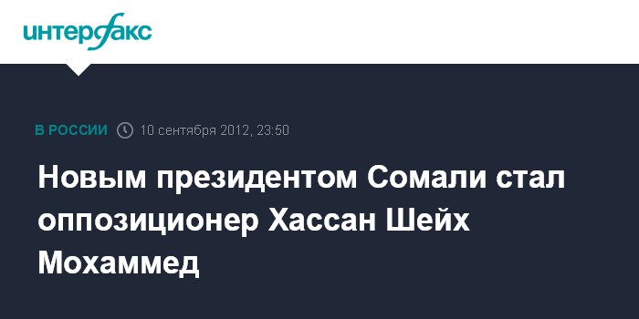 Могадишо. 10 сентября. INTERFAX.RU - Оппозиционер Хассан Шейх Мохаммед объявлен новым президентом Сомали, сообщает в понедельник агентство ЭФЭ.