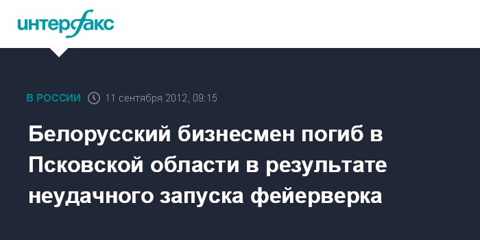 Псков. 11 сентября. INTERFAX.RU - Бизнесмен из Белоруссии погиб в Псковской области в результате в результате неудачного запуска фейерверка, сообщает пресс-служба регионального управления СКР.