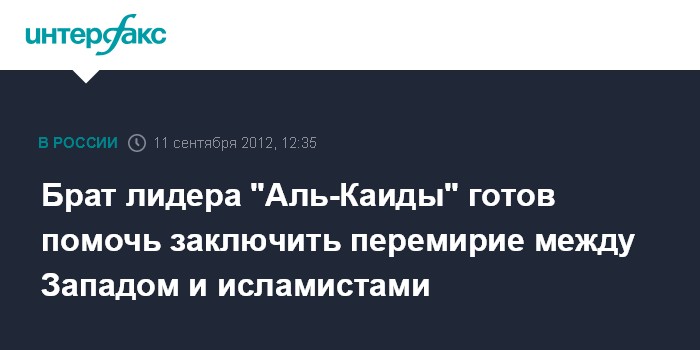 Лондон. 11 сентября. INTERFAX.RU - Брат лидера террористической организации "Аль-Каида" Аймана Завахири Мохамед предложил стать посредником между исламистами и странами Запада для заключения перемирия, передает британская телерадиовещательная корпорация Би-би-си