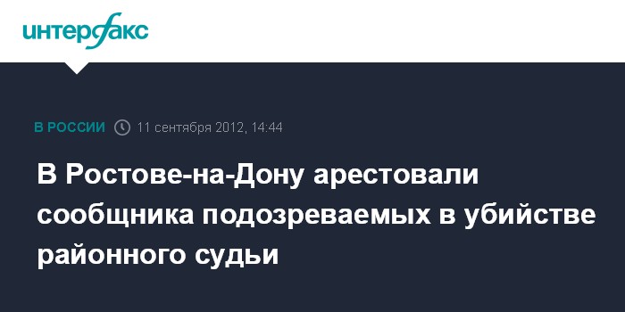 Москва. 11 сентября. INTERFAX.RU - Арестован сообщник подозреваемых в убийстве районного судьи в Ростовской области, сообщил официальный представитель СК РФ Владимир Маркин.