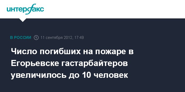 Москва. 11 сентября. INTERFAX.RU - На пожаре в подмосковном Егорьевске погибли 10 человек, сообщили "Интерфаксу" в управлении информации МЧС России. "Число жертв пожара составило 10 человек, предположительно это гастарбайтеры", - сказали в управлении.