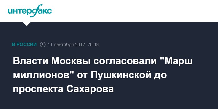 Москва. 11 сентября. INTERFAX.RU - Московская мэрия согласовала оппозиционный "Марш миллионов" 15 сентября по маршруту от станции метро "Пушкинская" до проспекта академика Сахарова с последующим митингом, сообщил лидер "Левого фронта" Сергей Удальцов.