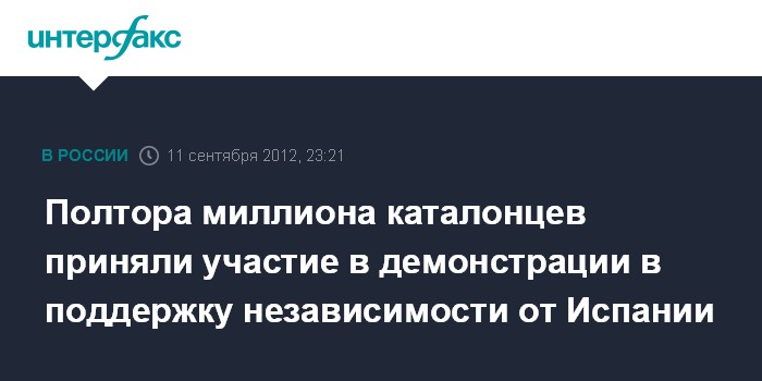 Мадрид. 12 сентября. INTERFAX.RU - Около 1,5 млн человек приняли участие в манифестации в Барселоне в поддержку независимости Каталонии от Испании, сообщает испанская газета "Мундо".