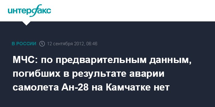 Петропавловск-Камчатский. 12 сентября. ИНТЕРФАКС-ДАЛЬНИЙ ВОСТОК - По предварительным данным, все 14 человек, находившиеся на борту самолета Ан-28, совершившего вынужденную посадку в районе поселка Палана на севере Камчатки, живы.