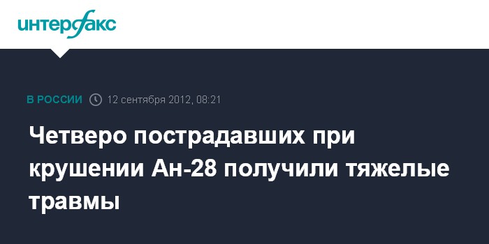 Владивосток. 12 сентября. INTERFAX.RU - Четверо пострадавших при крушении Ан-28 на Камчатке получили травмы средней и высокой степени тяжести, сообщил агентству "Интерфакс - Дальний Восток" руководитель пресс-службы ДВРЦ МЧС Сергей Викторов.