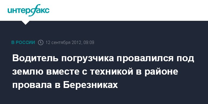 Пермь. 12 сентября. INTERFAX.RU - Водитель погрузчика ушел под землю вместе с машиной в районе проседания грунта возле одного из нефункционирующих зданий Березниковского шахтостроительного управления ОАО "Уралкалий", сообщает СУ СКР региона в среду.