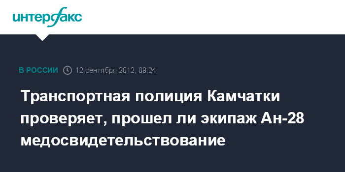 Владивосток. 12 сентября. INTERFAX.RU - Транспортные полицейские Камчатки занимаются уточнением полетных списков, проверкой информации о предполетном инструктаже и медицинском освидетельствовании экипажа Ан-28, который разбился в среду около поселка Палана.