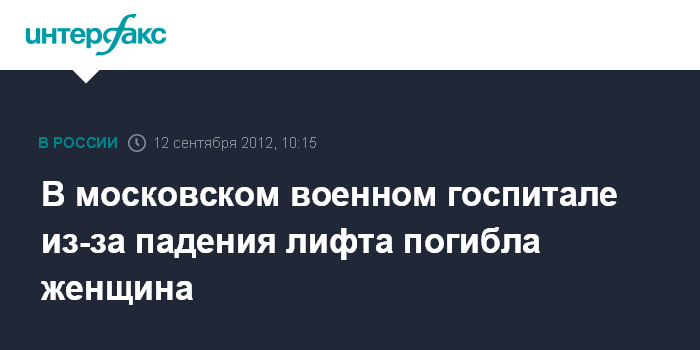 Москва. 12 сентября. INTERFAX.RU - Лифт упал и убил работницу военного госпиталя в центре Москвы, сообщил "Интерфаксу" источник в правоохранительных органах.