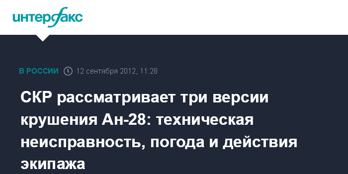 Москва. 12 сентября. INTERFAX.RU - В качестве версий крушения самолета Ан-28 на Камчатке рассматриваются техническая неисправность, метеоусловия и человеческий фактор, сообщили в Следственном комитете РФ.