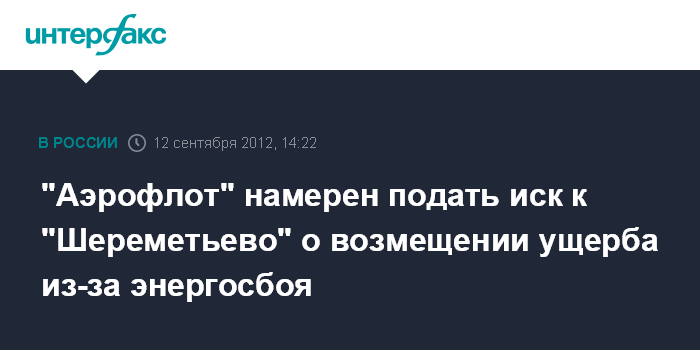 Москва. 12 сентября. INTERFAX.RU - ОАО "Аэрофлот - российские авиалинии" намерено подать иск к ОАО "Международный аэропорт Шереметьево" о возмещении ущерба деятельности авиакомпании и причиненных неудобств пассажирам, сообщил "Интерфаксу" официальный представитель компании. "Мы намерены подать иск о возмещении ущерба деятельности авиакомпании и причиненных неудобств пассажирам", - заявил он, добавив, что компания пока не подсчитала свои издержки.