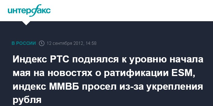 Москва. 12 сентября. INTERFAX.RU - Российский рынок акций днем в среду поднялся к уровням начала мая по индексу РТС на новостях о ратификации конституционным судом Германии соглашения о создании Европейского механизма стабильности (European Stability Mechanism, ESM), рублевый индекс ММВБ просел из-за укрепления рубля к доллару.
