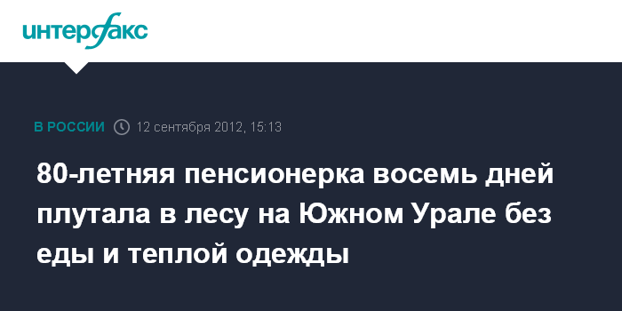 Челябинск. 12 сентября. INTERFAX.RU - Спасатели Миасского отряда поисково-спасательной службы Челябинской области неделю безуспешно искали в лесу 82-летнюю женщину, ушедшую за грибами, и после того, как поиски было решено прекратить, обессиленную пенсионерку нашли родные.