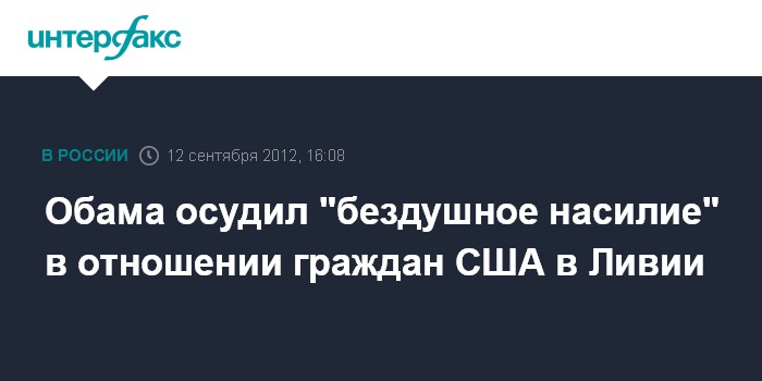Вашингтон. 12 сентября. INTERFAX.RU - Президент США Барак Обама назвал "возмутительной атакой" убийство посла страны в Ливии и еще трех американцев в результате нападения боевиков на консульство США в ливийском городе Бенгази. Он также призвал усилить безопасность сотрудников американских дипломатических миссий по всему миру.