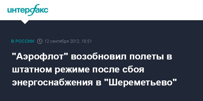 Москва. 12 сентября. INTERFAx.RU - ОАО "Аэрофлот - российские авиалинии" восстановило работу в штатном режиме после произошедшего в среду утром сбоя в энергоснабжении аэропорта "Шереметьево", задержаны 2 рейса - в Самару и в Киев, сообщила пресс-служба авиаперевозчика.