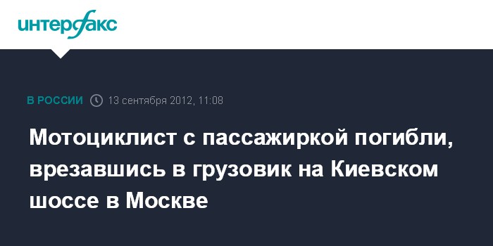 Москва. 13 сентября. INTERFAX.RU - Два человека погибли в ДТП с участием мотоцикла на Киевском шоссе в Москве, сообщил "Интерфаксу" источник в правоохранительных органах.