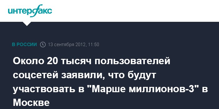 Москва. 13 сентября. INTERFAX.RU - Тысячи пользователей социальных сетей Facebook и ВКонтакте заявили, что примут участие в субботней акции "Марш миллионов-3" в Москве, свидетельствуют данные, опубликованные в официальных группах мероприятия.
