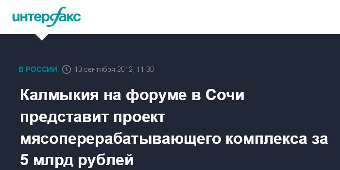 Элиста. 13 сентября. INTERFAX.RU - Калмыкия на XI международном инвестиционном форуме "Сочи-2012" представит проект строительства мясоперерабатывающего комплекса стоимостью 5 млрд рублей, сообщает пресс-служба правительства региона.