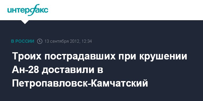 Петропавловск-Камчатский. 13 сентября. INTERFAX.RU - Самолет с тремя пострадавшими в авиакатастрофе Ан-28 на севере Камчатки - мужчиной, женщиной и подростком, прилетел из Паланы в Петропавловск-Камчатский, сообщил в четверг агентству "Интерфакс" представитель министерства здравоохранения региона.
