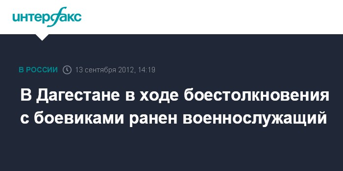 Ростов-на-Дону. 13 сентября. INTERFAX.RU - Военнослужащий внутренних войск получил ранение в результате боевого столкновения с неустановленной бандгруппой в Кизлярском районе (Дагестан), сообщили агентству "Интерфакс-Юг" источник в правоохранительных органах республики.