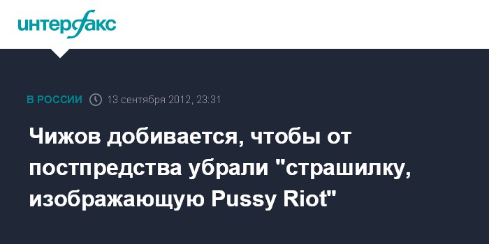 В беседе с журналистами в четверг Чижов сообщил, что некоторое время назад бельгийское отделение правозащитной организации Amnesty International незаконно установило через дорогу от постпредства конструкцию со своей символикой и "со страшилкой, изображающей Pussy Riot", которую "нельзя показывать детям не только потому, что неприлично, но и выглядит страшно".