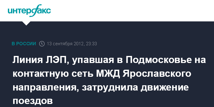 Москва. 13 сентября. INTERFAX.RU - Высоковольтная линия электропередачи (ЛЭП) упала на контактную сеть на перегоне Хотьково - Сергиев Посад Московской железной дороги, сообщили "Интерфаксу" в службе корпоративных коммуникаций ОАО МЖД.