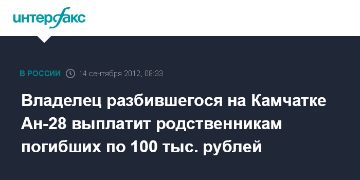 Владелец разбившегося на Камчатке Ан-28 выплатит родственникам погибших по 100 тыс. рублей