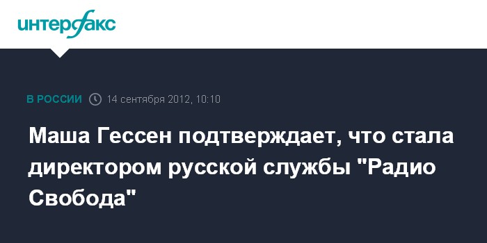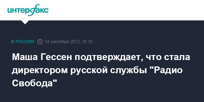 Москва. 14 сентября. INTERFAX.RU- Бывший главный редактор журнала "Вокруг света" Мария Гессен заявляет о своем назначении на должность директора русской службы "Радио Свобода".
