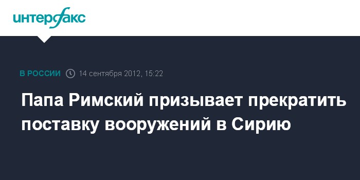 Бейрут. 14 сентября. INTERFAX.RU - Папа Римский Бенедикт XVI в пятницу по прибытии в Ливан выступил с призывом прекратить поставлять вооружение в Сирию. По его словам, "импорт вооружений в Сирию - это великий грех".