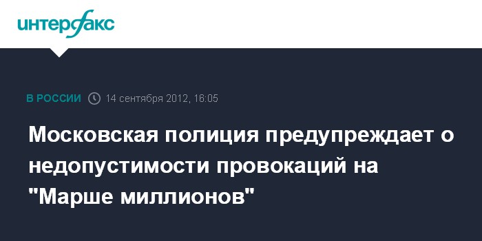 Москва. 14 сентября. INTERFAX.RU - Полиция располагает данными о готовящихся провокациях во время массового мероприятия, которое пройдет в субботу в центре Москвы, сообщили "Интерфаксу" в пресс-службе столичного главка МВД. "В московской полиции имеется информация о том, что отдельные граждане по завершению завтрашнего мероприятия планируют устроить провокации и будут призывать участников акции к нарушению общественного порядка, в частности, перекрытию движения автотранспорта", - сказал собеседник агентства.