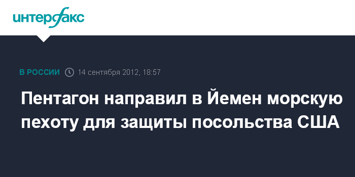 Вашингтон. 14 сентября. INTERFAX.RU - США направили в Йемен морпехов для защиты американского посольства в Сане, сообщили в пятницу в американском оборонном ведомстве.