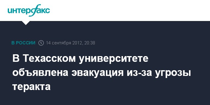 Вашингтон. 14 сентября. INTERFAX.RU - Администрация Техасского университета в американском городе Остин распорядилась эвакуировать всех находящихся в здании людей, сообщает в пятницу телеканал NBC.