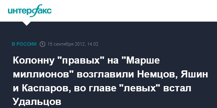 Москва. 15 сентября. INTERFAX.RU - Оппозиционеры Борис Немцов, Илья Яшин и Гарри Каспаров прибыли на Тверской бульвар и возглавили правую колонну "Марш миллионов".