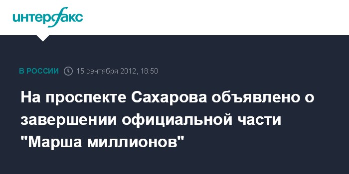 Москва. 15 сентября. INTERFAX.RU - Один из лидеров оппозиционного движения "Солидарность" Сергей Давидис объявил на проспекте Сахарова о завершении официальной части "Марша миллионов", отметив, что акция продолжается.