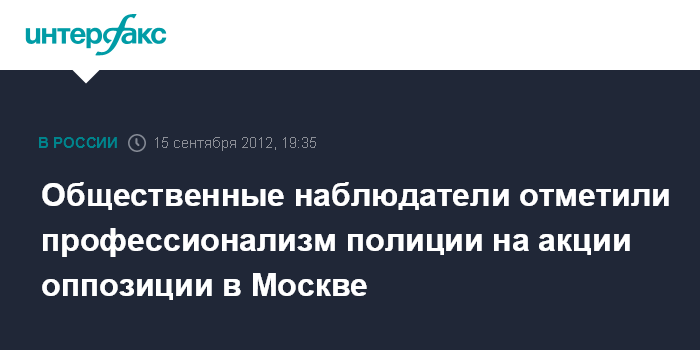 Москва. 15 сентября. INTERFAX.RU - Общественные наблюдатели положительно оценивают работу столичной полиции во время проведения акции оппозиции в центре Москвы.
