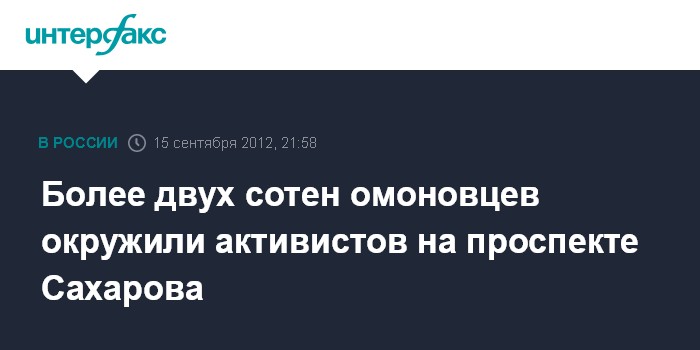 Москва. 15 сентября. INTERFAX.RU - ОМОН готовится расчищать проспект Сахарова. Как сообщил корреспондент агентства "Интерфакс", на данный момент группу активистов окружили около 200-300 омоноцев.