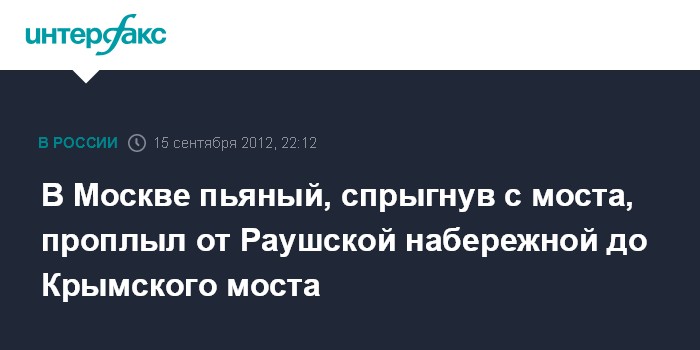 Москва.15 сентября. INTERFAX.RU - В центре Москвы нетрезвый мужчина бросился в воду Москва-реки в районе Раушской набережной, сообщил "Интерфаксу" источник в правоохранительных органах.