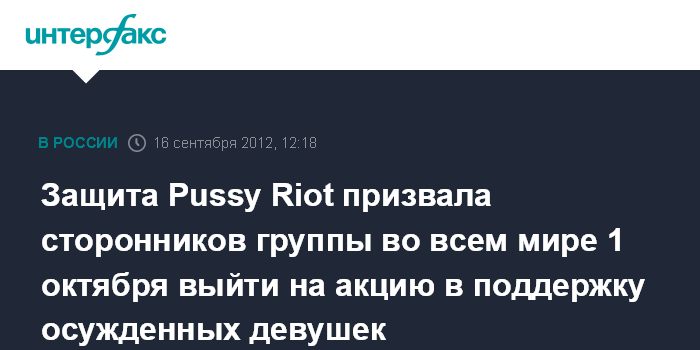 Москва. 16 сентября. INTERFAX.RU - Адвокаты участниц панк-группы Pussy Riot призывают их сторонников во всем мире выйти 1 октября на акцию в поддержку девушек.