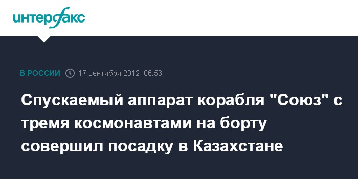 Королев (Московская область). 17 сентября. ИНТЕРФАКС-АВН - Спускаемый аппарат пилотируемого корабля "Союз ТМА-04М" с тремя космонавтами из экипажа МКС-31/32 на борту в 06:52 МСК совершил посадку близ города Аркалык (Казахстан), сообщает корреспондент "Интерфакса-АВН" из подмосковного Центра управления полетами (ЦУП).