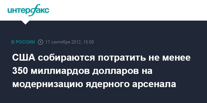 Вашингтон. 17 сентября. INTERFAX.RU - Несмотря на сокращение расходов на военные нужды, Вашингтон собирается потратить огромную сумму на модернизацию устаревшего ядерного арсенала, пишет в понедельник газета The Washington Post.