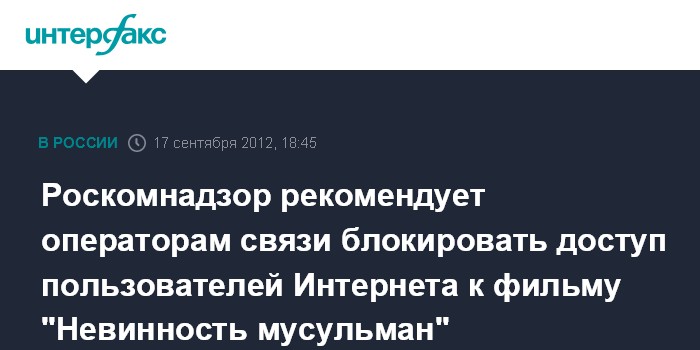 Роскомнадзор рекомендует операторам связи блокировать доступ пользователей Интернета к фильму "Невинность мусульман"