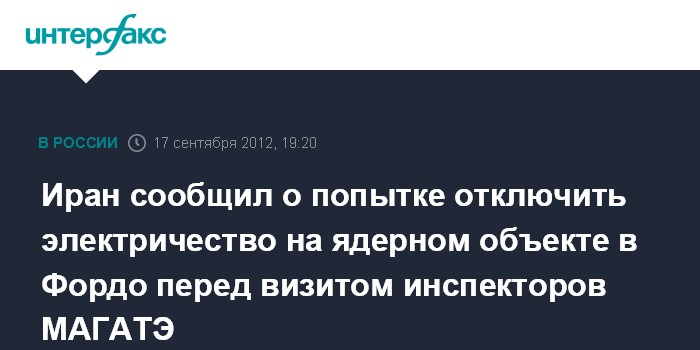 Вена. 17 сентября. INTERFX.RU - В прошлом месяце неизвестные при помощи взрывчатки отключили электричество на иранском ядерном объекте в Фордо, заявил в понедельник глава иранской Организации по атомной энергии Ферейдун Аббаси-Давани на Генеральной конференции МАГАТЭ.