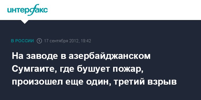 Баку. 17 сентября. INTERFAX.RU - На горящем заводе по производству моющих средств и стирального порошка в городе Сумгаит, где погибли пять человек, произошел еще один взрыв, сообщает корреспондент "Интерфакс" с места событий.