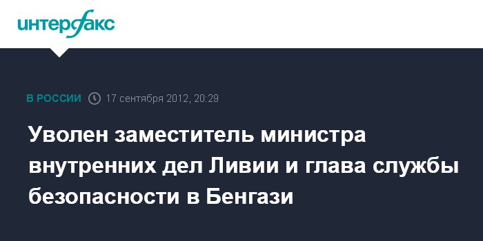 Вашингтон. 17 сентября. INTERFAX.RU - Власти Ливии отстранили от должности заместителя министра внутренних дел и начальника отделения службы безопасности в Бенгази, сообщил в понедельник американский канал NBC.