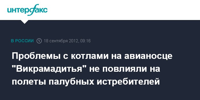 Москва. 18 сентября. INTERFAX.RU - Полеты корабельных истребителей МиГ-29К/КУБ с палубы авианосца "Викрамадитья" (бывший российский тяжелый авианесущий крейсер "Адмирал Горшков"), несмотря на определенные проблемы с энергетической установкой корабля, продолжаются точно по графику.