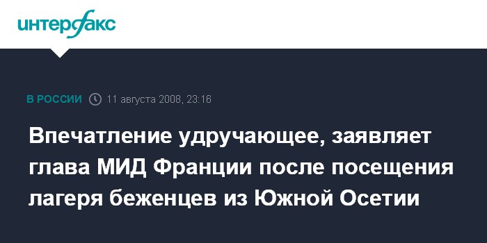Москва. 11 августа. INTERFAX.RU - Глава МИД Франции Бернар Кушнер заявил, что вынес тяжелое впечатление от посещения во Владикавказе лагеря беженцев из Южной Осетии. "Впечатление самое удручающее. Иначе и быть не может, когда видишь беженцев. Я думаю, через что они прошли, попав сюда, перенесли столько страданий, некоторые потеряли близких. Так что самое главное - добиться мира, и для этого мы сюда прибыли", - заявил он. Данное высказывание прозвучало в эфире новостей телеканала НТВ.