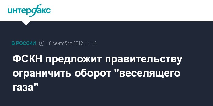 Москва. 18 сентября. INTERFAX.RU - Федеральная служба по наркоконтролю выступает за введение контроля за оборотом так называемого "веселящего газа", по поводу которого бьют тревогу медики.