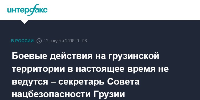 Тбилиси. 12 августа. INTERFAX.RU - В настоящее время нигде на грузинской территории не ведутся боевые действия, заявил поздно вечером в понедельник на брифинге секретарь Совета национальной безопасности Грузии Александр Ломая. По его словам, российские войска контролируют регионы Самегрело и Шида Картли