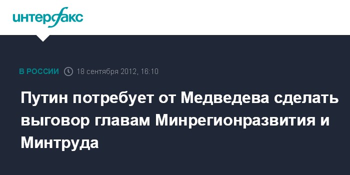 Сочи (Бочаров ручей). 18 сентября. INTERFAX.RU - Президент РФ Владимир Путин заявил, что обратится к премьер-министру РФ Дмитрию Медведеву с тем, чтобы был сделан выговор главам Минрегионразвития и Минтруда РФ в связи с невыполнением указов главы государства от 7 мая.