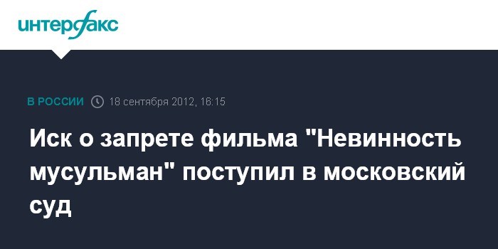 Москва. 17 сентября. INTERFAX.RU - В Тверской суд Москвы поступил иск Генпрокуратуры РФ о признании экстремистским размещенного в Интернете антиисламского фильма "Невинность мусульман", вызвавшего массовые беспорядки во многих странах мира.